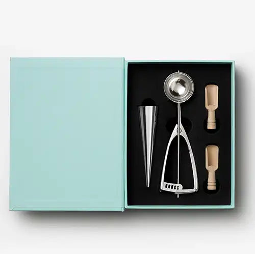 Entdecken Sie unser Essential Ice Cream Kit, geschickt getarnt als elegante buchähnliche Box. Beim Öffnen entdecken Sie alle wichtigen Utensilien für eine gelungene Eiscreme-Party. Alle Werkzeuge sind aus Edelstahl und spülmaschinenfest.
